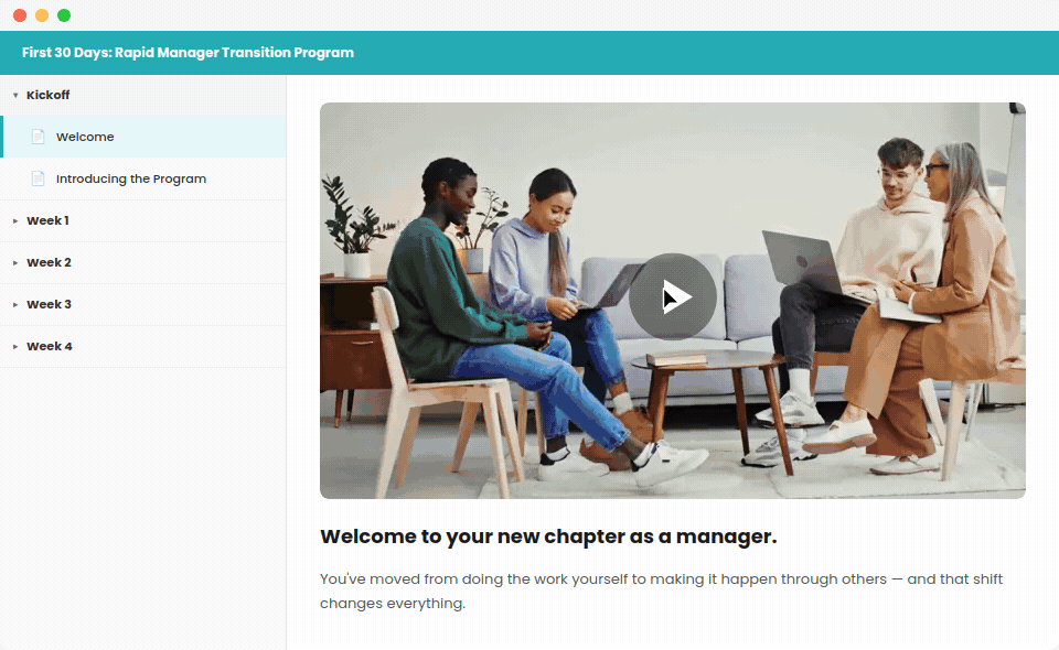 First 30 Days: Rapid Manager Transition Program is an AI-coached applied learning journey for new manager delivering workshop impact without travel